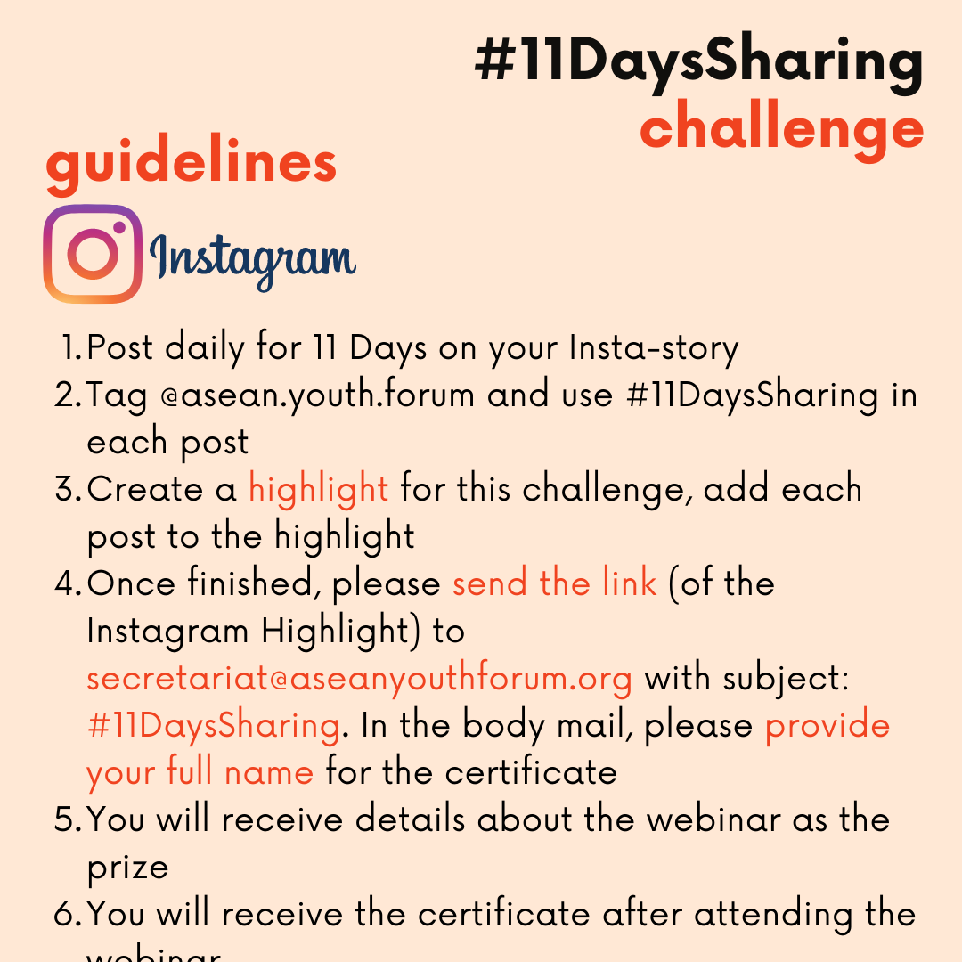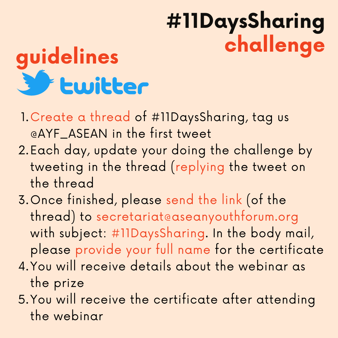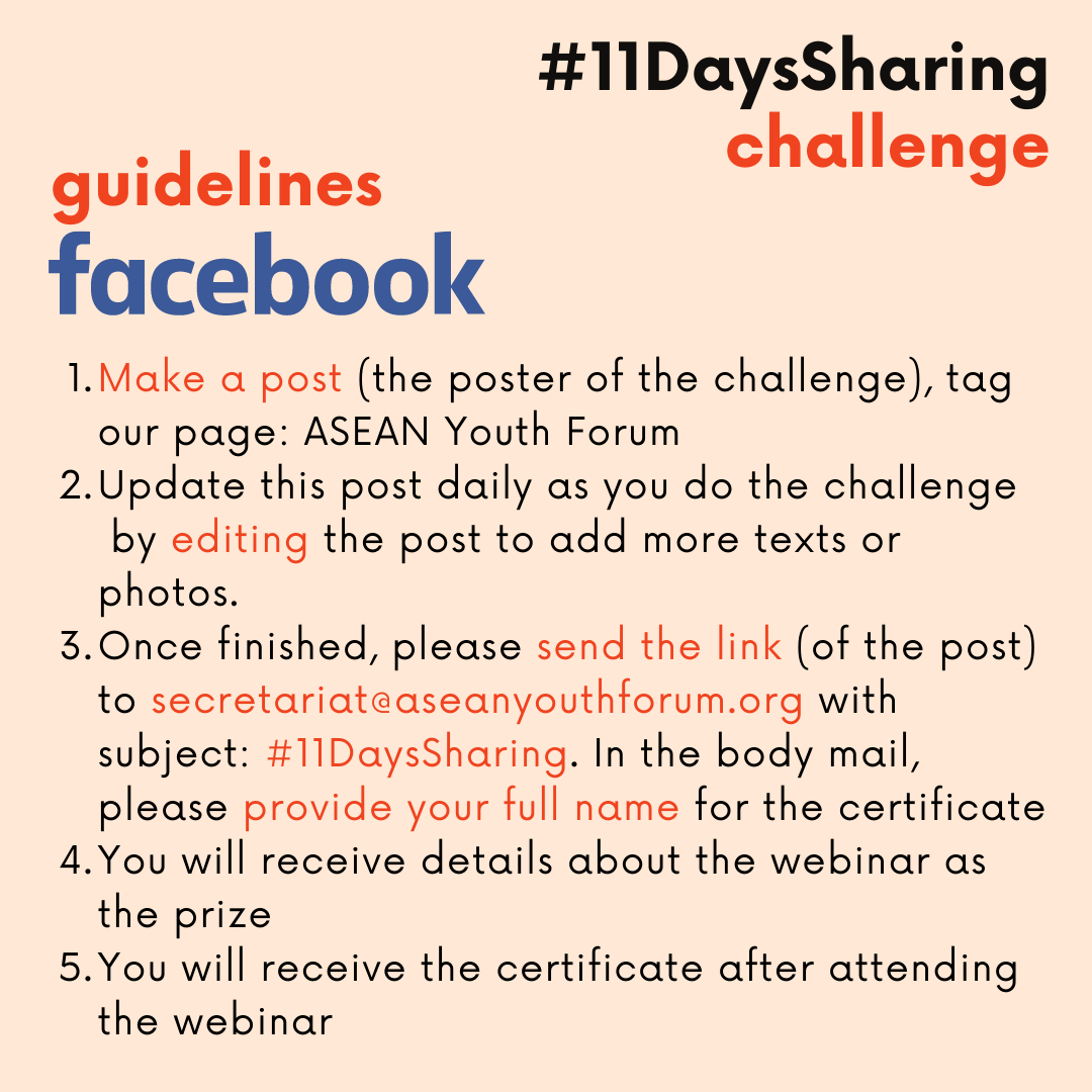 ASEAN Youth Forum (AYF) has been bringing youth in Southeast Asia together, and this time, AYF is challenging youth to do digital activism through #11DaysSharing challenge. It’s an 11-day challenge of content posting on social media (Instagram, Facebook, Twitter) which covers a range of fun topics and some important youth advocacy issues in Southeast Asia. This project is initiated by our dearest friends from Vietnam, Zoe / Nguyen Phan Thuy Linh. We hope we can get to know you more, and at the same time, you can get to know more about some issues in Southeast Asia.